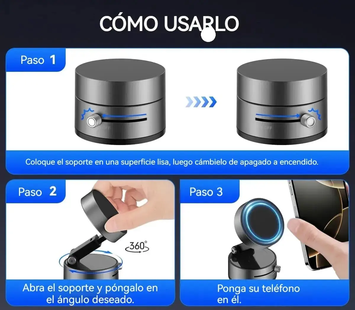 Diseño elegante, práctico y potente. Colocá tu celular en un segundo con su fuerte imán de neodimio.